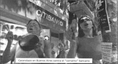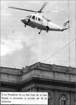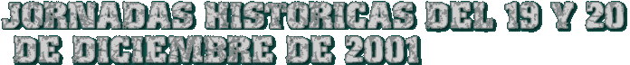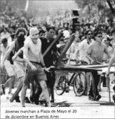 Finalmente la larga recesión del '98 al 2001 coronó el cambio de siglo. La mitad de población por debajo de la línea de la pobreza, niños que se mueren de hambre en los hospitales públicos sin medicamentos, 21% de desocupación, subsidios de desempleo miserables, una inflación que se dispara, caída en picada del PIB, y un largo etcétera. Menem , con el apoyo del FMI, los gobiernos de EEUU y de España; y su sucesor, De La Rúa se han encargado, en los últimos años, de dirigir al país hacia la crisis política y económica más importante de su historia. LAS JORNADAS DEL 19 Y 20 DE DICIEMBRE Todos estos planes han generado resistencia entre la población. Huelgas Generales , manifestaciones, luchas obreras y populares. Pero es recién al final de 2001, cuando la población logra parar en seco estos planes del Capital. Las históricas jornadas del 19 y 20 de diciembre que han conseguido la renuncia del entonces presidente, Fernando De La Rúa, han cambiado la realidad política del pueblo argentino. Entre el 16 de diciembre y el 18 se organizaron lo que la prensa servil del poder ha denominado "saqueos". Los estratos más pobres de la población acudieron a las grandes superficies y a todo tipo de negocio a tomar lo que le quitaron: alimentos principalmente. La policía empezó con la matanza de compañeros.